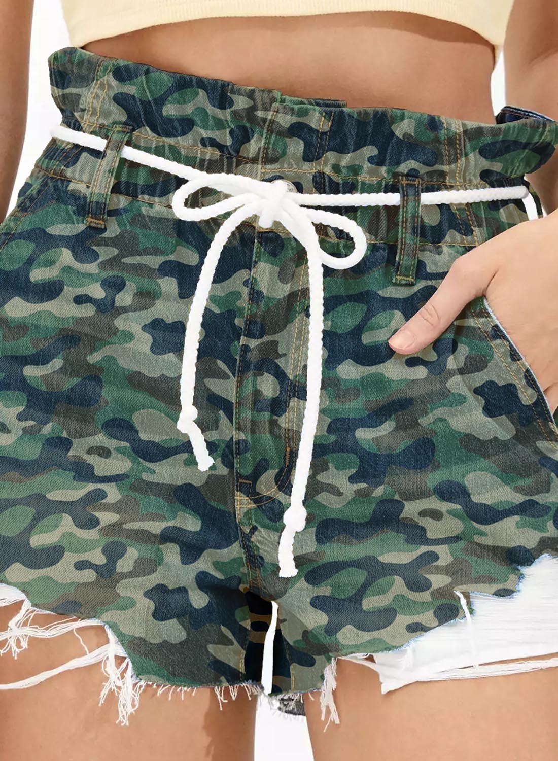 Package Content 1??Bottom Leg Type Straight Pattern Camouflage Waist Type High Waist Occasion Daily Inseam 10 Bottom Length Short Style Casual Material 75%Cotton+23%Polyester+2%Spandex Season Summer Detail Cut-out,Belt Size(cm) Waist Hip Front Rise Back Rise Inseam S 64 101 30 39 10 M 69 106 31 40 10 L 74 111 32 41 10 XL 79…